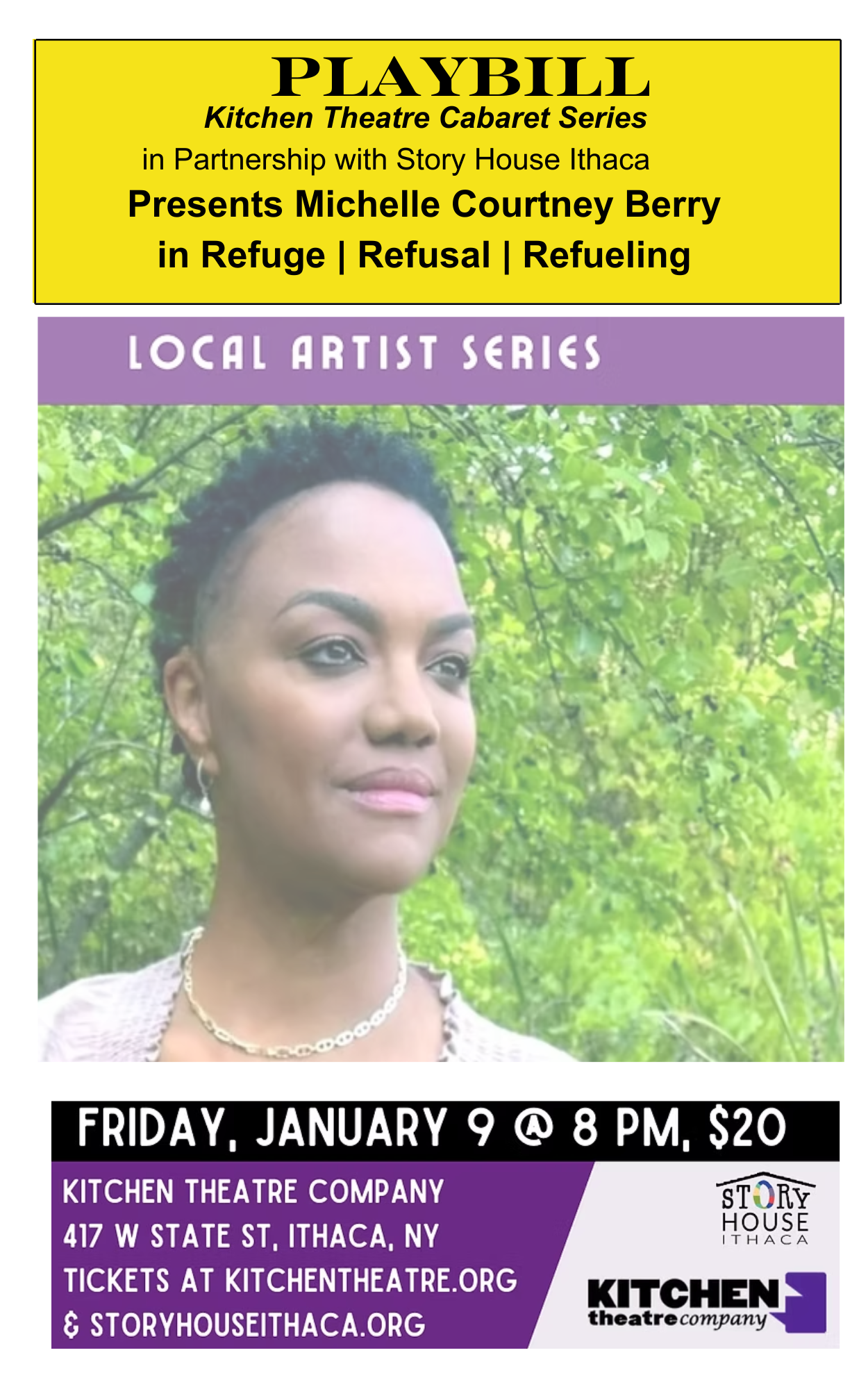 Award-winning playwright, second Poet Laureate of Tompkins County, comedian, actor, and community leader Michelle Courtney Berry takes the Kitchen Theatre lobby stage for an evening that’s equal parts retrospective and revival. Intimate and immediate, Refuge | Refusal | Refueling weaves theatre, comedy, poetry, and song into a cabaret-style gathering that invites both longtime followers and brand-new audiences into Michelle's body of work.
